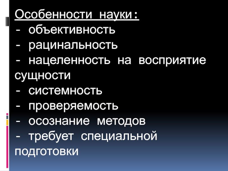 Особенности науки: - объективность - рацинальность - нацеленность на восприятие сущности - системность - проверяемость - осознание