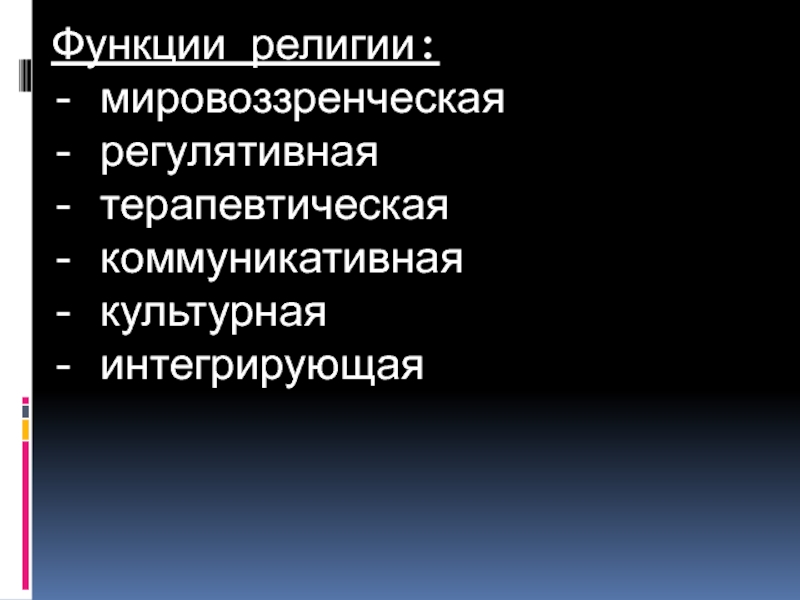 Функции религии: - мировоззренческая - регулятивная - терапевтическая - коммуникативная - культурная - интегрирующая