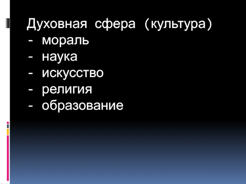 Слайд 4Духовная сфера (культура) - мораль - наука - искусство - религия - образование