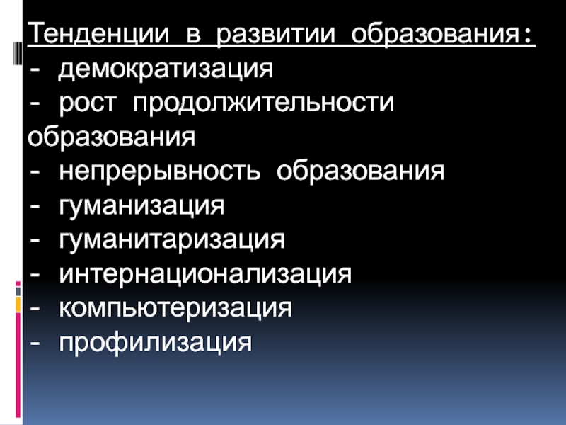 Тенденции в развитии образования: - демократизация - рост продолжительности образования - непрерывность образования - гуманизация - гуманитаризация
