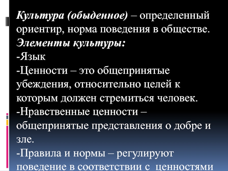 Слайд 3Культура (обыденное) – определенный ориентир, норма поведения в обществе. Элементы культуры: -Язык -Ценности