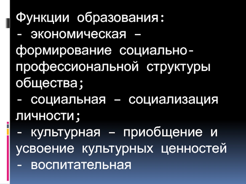 Функции образования: - экономическая – формирование социально-профессиональной структуры общества; - социальная – социализация личности; - культурная –