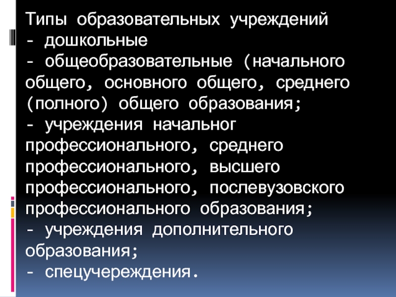Слайд 19Типы образовательных учреждений - дошкольные - общеобразовательные (начального общего, основного общего, среднего(полного) общего