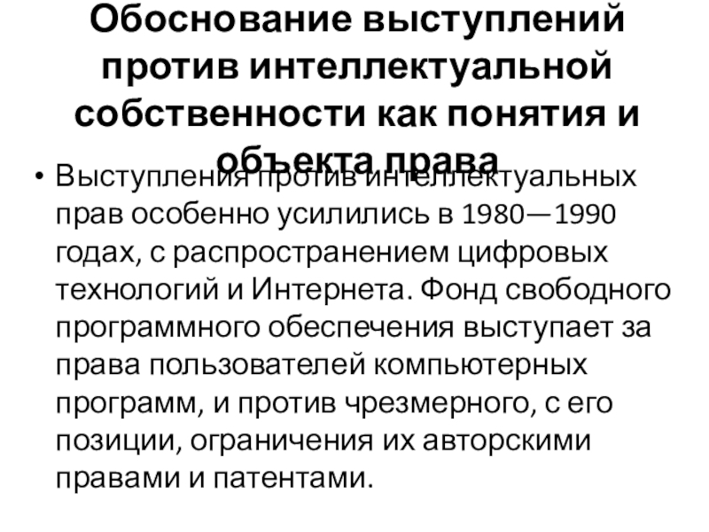 Слайд 16Обоснование выступлений против интеллектуальной собственности как понятия и объекта права