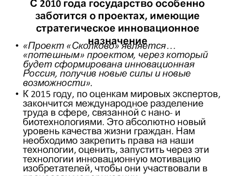 «Проект «Сколково» является… «потешным» проектом, через который будет сформирована инновационная Россия, получив новые силы и новые возможности».