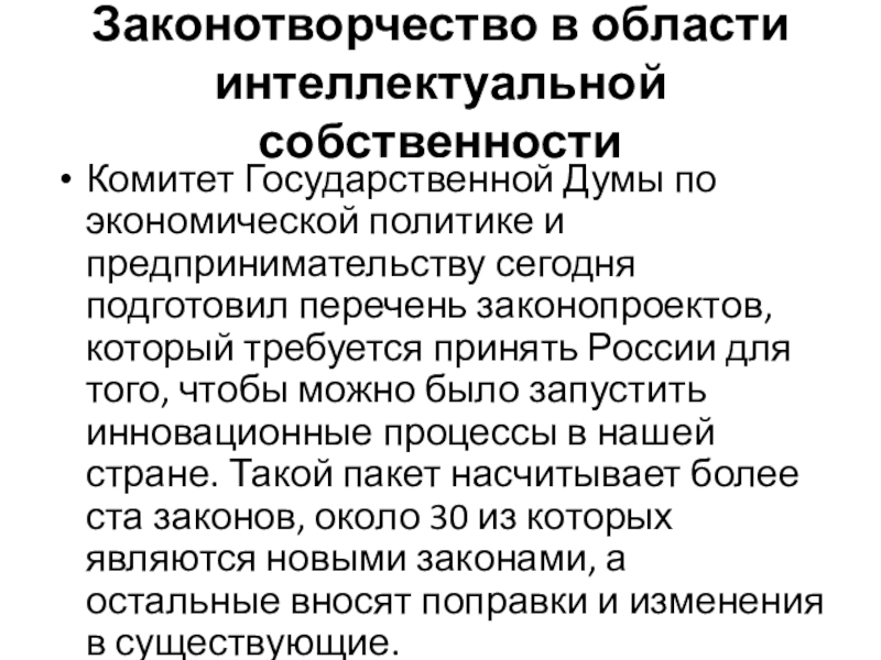 Слайд 27Законотворчество в области интеллектуальной собственности