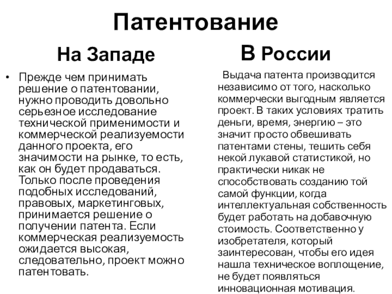 Выдача патента производится независимо от того, насколько коммерчески выгодным является проект. В таких условиях тратить деньги, время, энергию – это значит просто обвешивать патентами стены, тешить себя некой лукавой статистикой, но практически никак не способствовать созданию той самой функции, когда интеллектуальная собственность будет работать на добавочную стоимость. Соответственно у изобретателя, который заинтересован, чтобы его идея нашла техническое воплощение, не будет появляться инновационная мотивация.