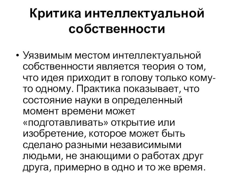 Уязвимым местом интеллектуальной собственности является теория о том, что