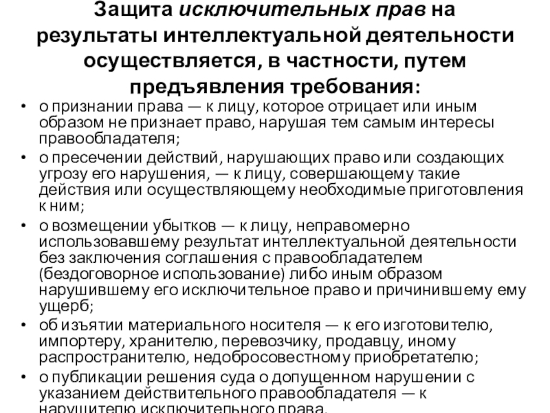 Слайд 18Защита исключительных прав на результаты интеллектуальной деятельности осуществляется, в частности, путем предъявления требования: