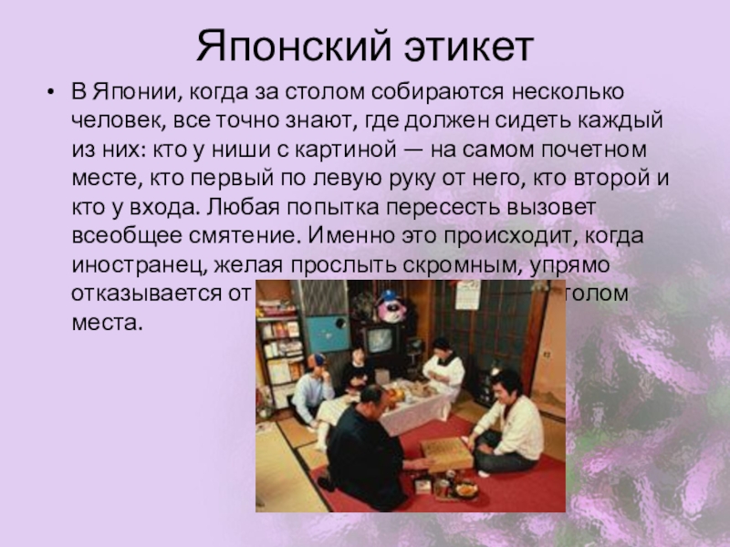 знают, где должен сидеть каждый из них: кто у ниши с картиной — на самом почетном месте, кто первый по левую руку от него, кто второй и кто у входа. Любая попытка пересесть вызовет всеобщее смятение. Именно это происходит, когда иностранец, желая прослыть скромным, упрямо отказывается от предназначенного ему за столом места.