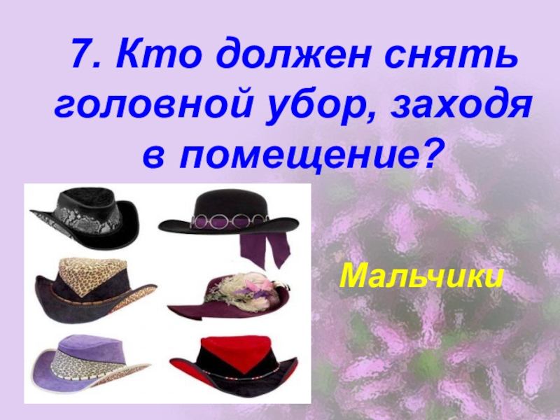 Слайд 317. Кто должен снять головной убор, заходя в помещение?