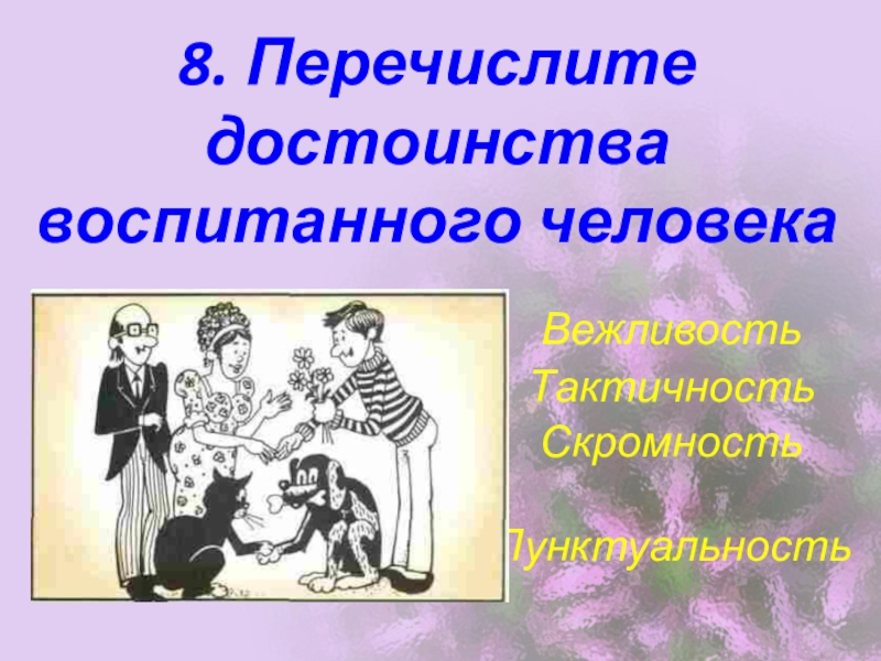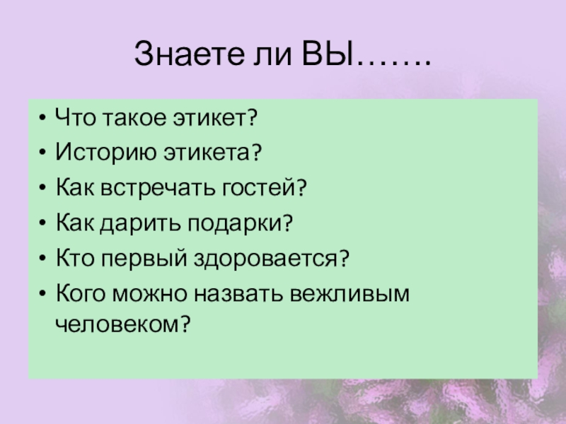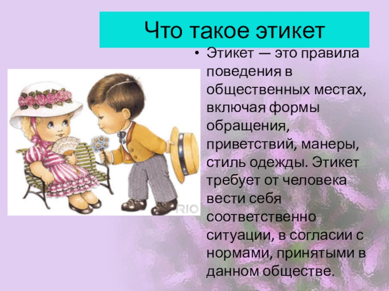 формы обращения, приветствий, манеры, стиль одежды. Этикет требует от человека вести себя соответственно ситуации, в согласии с нормами, принятыми в данном обществе.