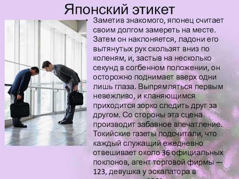 он наклоняется, ладони его вытянутых рук скользят вниз по коленям, и, застыв на несколько секунд в согбенном положении, он осторожно поднимает вверх одни лишь глаза. Выпрямляться первым невежливо, и кланяющимся приходится зорко следить друг за другом. Со стороны эта сцена производит забавное впечатление. Токийские газеты подсчитали, что каждый служащий ежедневно отвешивает около 36 официальных поклонов, агент торговой фирмы — 123, девушка у эскалатора в универмаге — 2560.