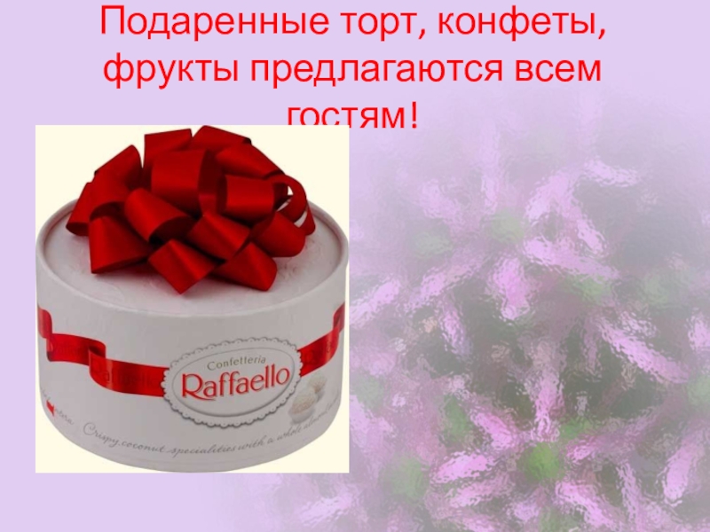 Слайд 18Подаренные торт, конфеты, фрукты предлагаются всем гостям!