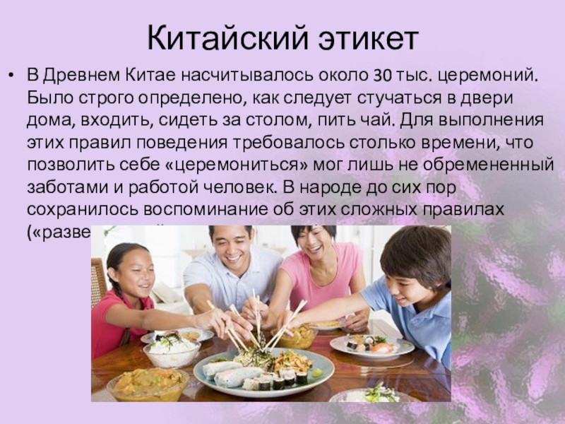 определено, как следует стучаться в двери дома, входить, сидеть за столом, пить чай. Для выполнения этих правил поведения требовалось столько времени, что позволить себе «церемониться» мог лишь не обремененный заботами и работой человек. В народе до сих пор сохранилось воспоминание об этих сложных правилах («развели китайские церемонии»).