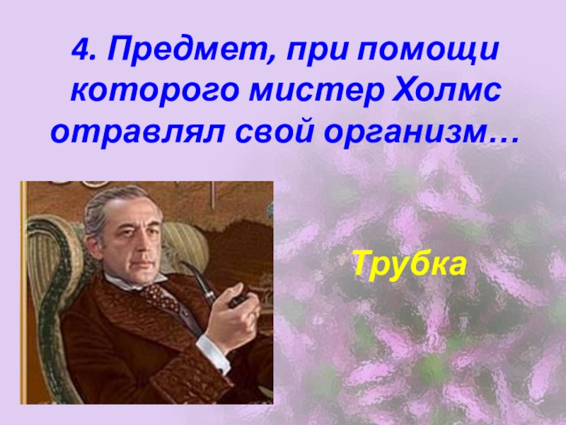 Слайд 274. Предмет, при помощи которого мистер Холмс отравлял свой организм…