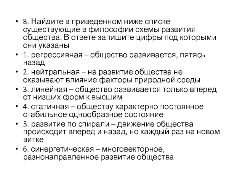 Слайд 308. Найдите в приведенном ниже списке существующие в философии схемы развития