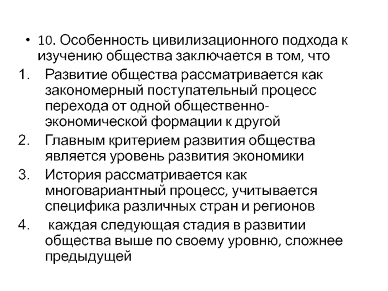 Слайд 3210. Особенность цивилизационного подхода к изучению общества заключается в том, что