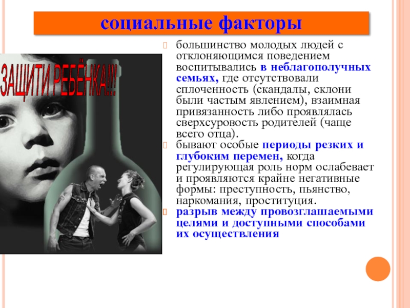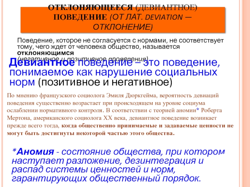 По мнению французского социолога Эмиля Дюркгейма, вероятность девиаций поведения существенно возрастает при происходящем на уровне социума ослаблении нормативного контроля. В соответствии с теорией аномии* Роберта Мертона, американского социолога ХХ века, девиантное поведение возникает прежде всего тогда, когда общественно принимаемые и задаваемые ценности не могут быть достигнуты некоторой частью этого общества.