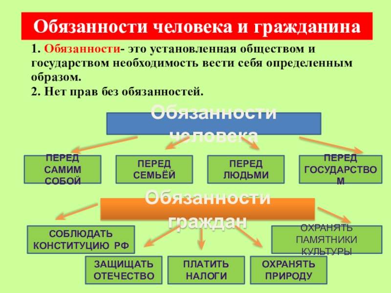 1. Обязанности- это установленная обществом и государством необходимость вести себя определенным образом.