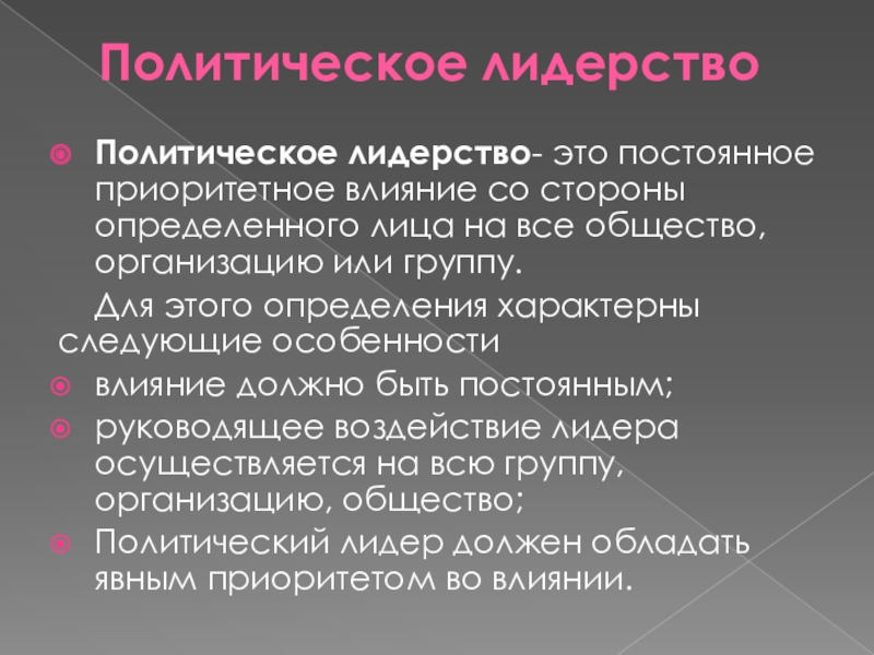 Политическое лидерство- это постоянное приоритетное влияние со стороны определенного лица