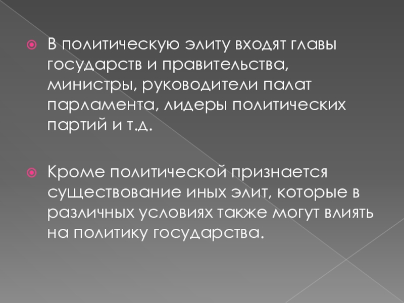 Слайд 3В политическую элиту входят главы государств и правительства, министры, руководители палат