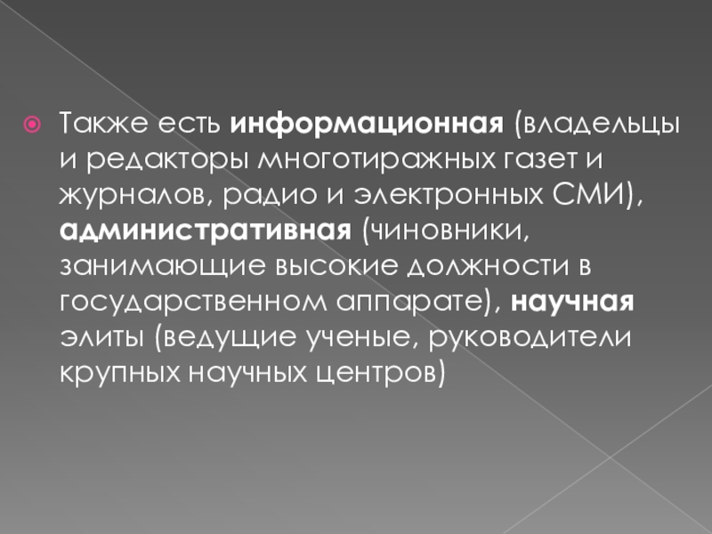 и электронных СМИ), административная (чиновники, занимающие высокие должности в государственном аппарате), научная элиты (ведущие ученые, руководители крупных научных центров)