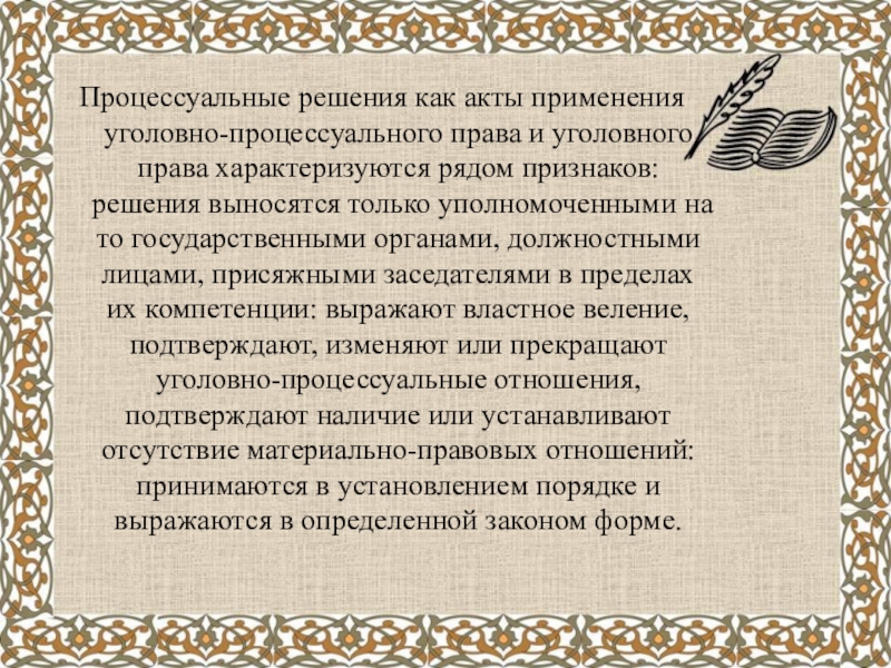 рядом признаков: решения выносятся только уполномоченными на то государственными органами, должностными лицами, присяжными заседателями в пределах их компетенции: выражают властное веление, подтверждают, изменяют или прекращают уголовно-процессуальные отношения, подтверждают наличие или устанавливают