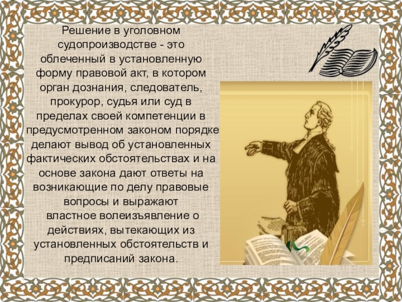 акт, в котором орган дознания, следователь, прокурор, судья или суд в пределах своей компетенции в предусмотренном законом порядке делают вывод об установленных фактических обстоятельствах и на основе закона дают ответы на возникающие по делу правовые вопросы и выражают