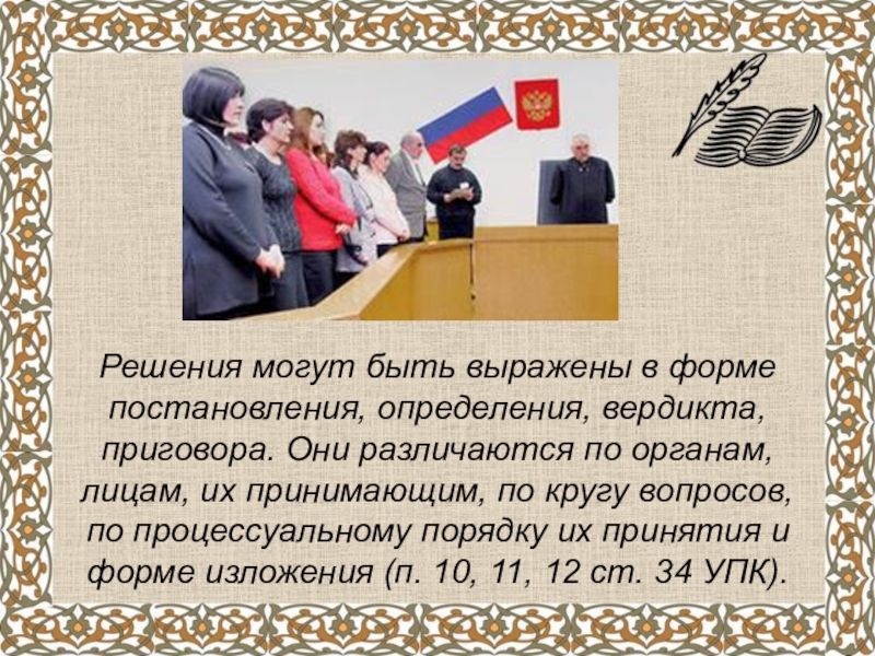 Решения могут быть выражены в форме постановления, определения, вердикта, приговора. Они