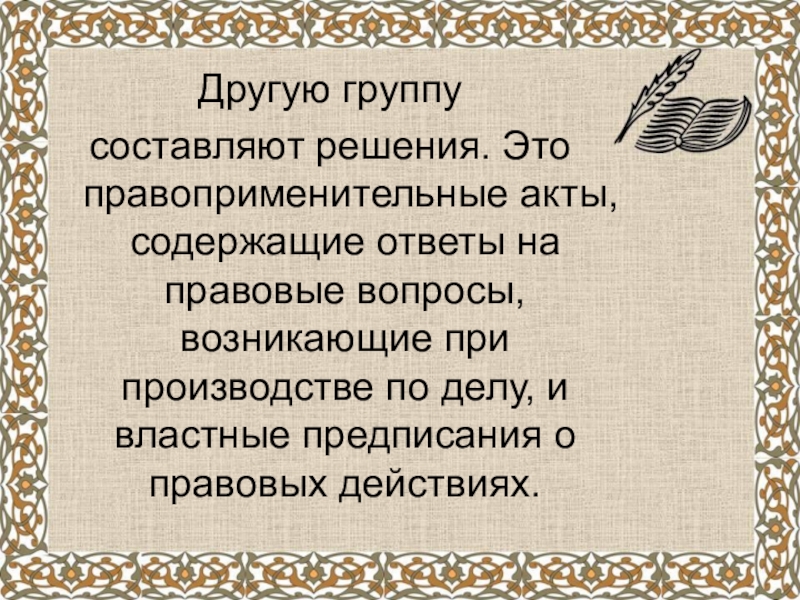 составляют решения. Это правоприменительные акты, содержащие ответы на правовые