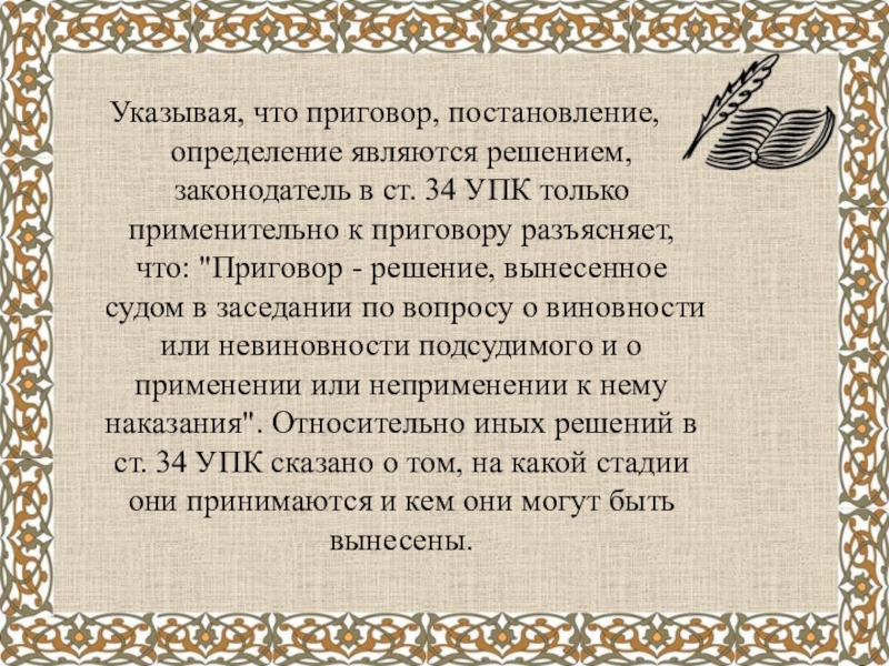 Указывая, что приговор, постановление, определение являются решением, законодатель в ст. 34