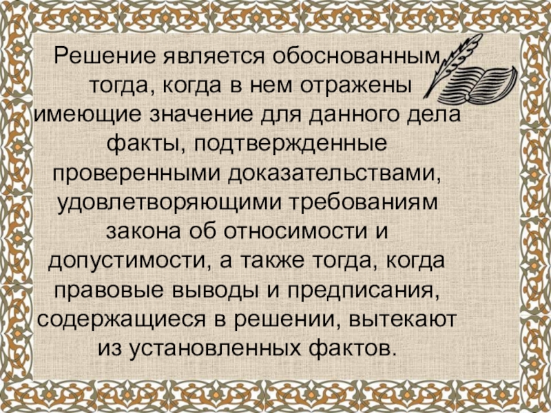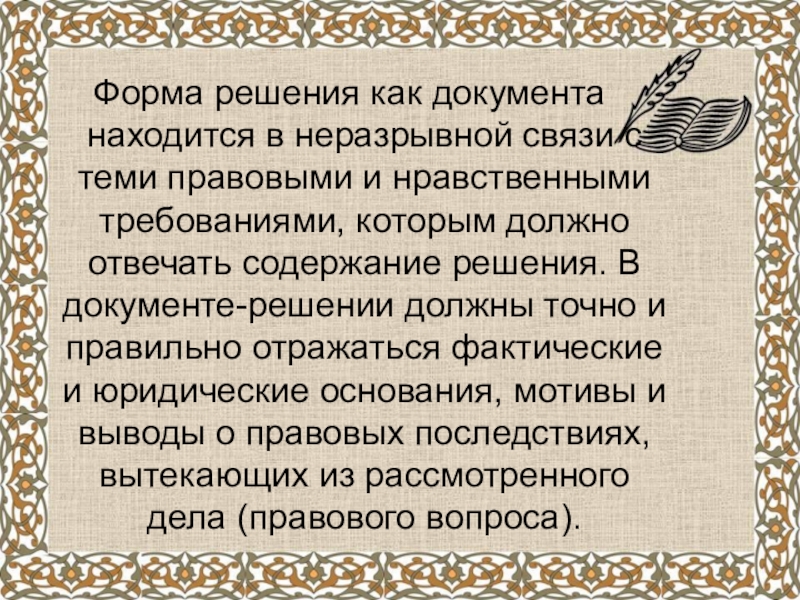 и нравственными требованиями, которым должно отвечать содержание решения. В документе-решении должны точно и правильно отражаться фактические и юридические основания, мотивы и выводы о правовых последствиях, вытекающих из рассмотренного дела (правового вопроса).