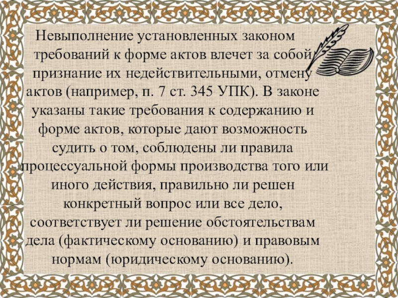 их недействительными, отмену актов (например, п. 7 ст. 345 УПК). В законе указаны такие требования к содержанию и форме актов, которые дают возможность судить о том, соблюдены ли правила процессуальной формы производства того или иного действия, правильно ли решен конкретный вопрос или все дело, соответствует ли решение обстоятельствам дела (фактическому основанию) и правовым нормам (юридическому основанию).