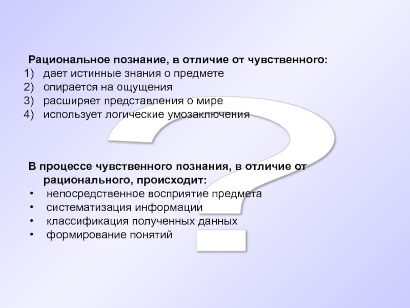 В процессе чувственного познания, в отличие от рационального, происходит: