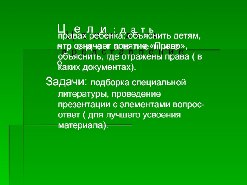 Задачи: подборка специальной литературы, проведение презентации с элементами вопрос- ответ ( для лучшего усвоения материала).