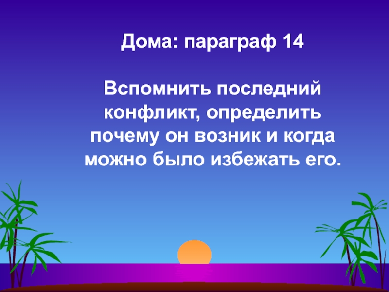 Дома: параграф 14Вспомнить последний конфликт, определить почему он возник и когда можно было избежать его.