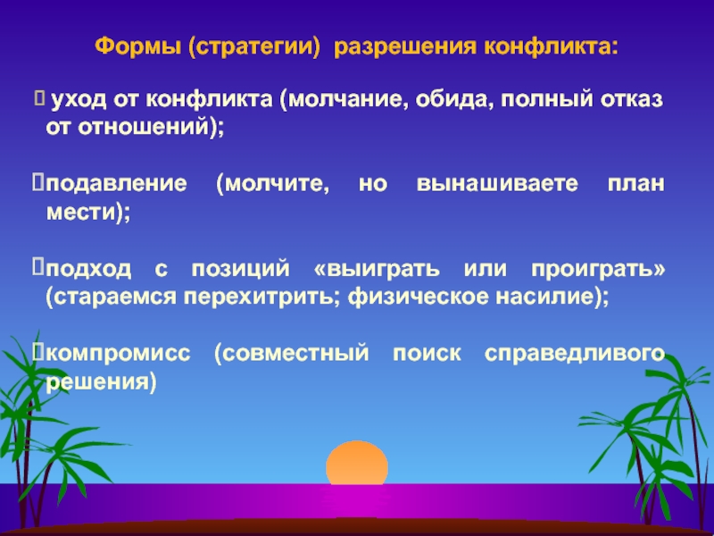 Формы (стратегии) разрешения конфликта: уход от конфликта (молчание, обида, полный отказ от отношений);подавление (молчите, но вынашиваете план