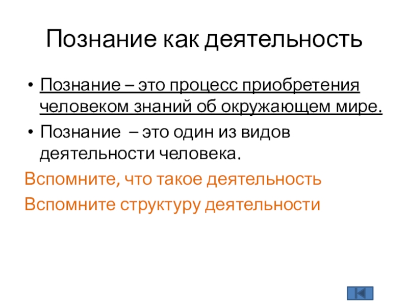 Познание как деятельностьПознание – это процесс приобретения человеком знаний об окружающем мире.Познание – это один из видов