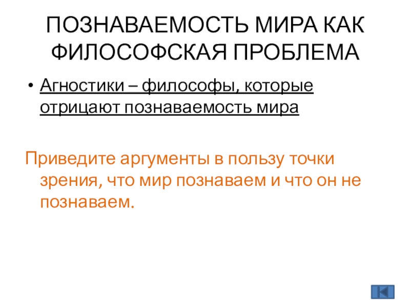ПОЗНАВАЕМОСТЬ МИРА КАК ФИЛОСОФСКАЯ ПРОБЛЕМААгностики – философы, которые отрицают познаваемость мираПриведите аргументы в пользу точки зрения, что