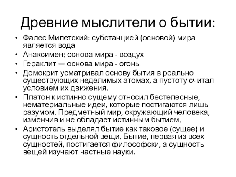 Древние мыслители о бытии:Фалес Милетский: субстанцией (основой) мира является водаАнаксимен: основа мира - воздух Гераклит — основа мира