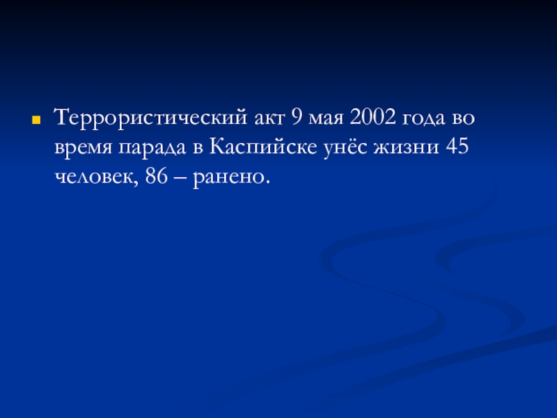 Террористический акт 9 мая 2002 года во время парада в Каспийске унёс жизни 45 человек, 86 –