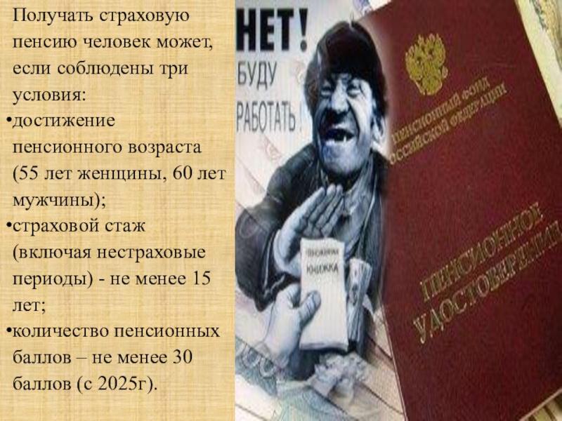 Слайд 35Получать страховую пенсию человек может, если соблюдены три условия: