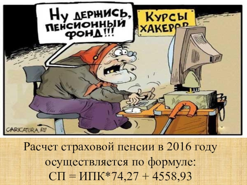 Слайд 34Расчет страховой пенсии в 2016 году осуществляется по формуле: