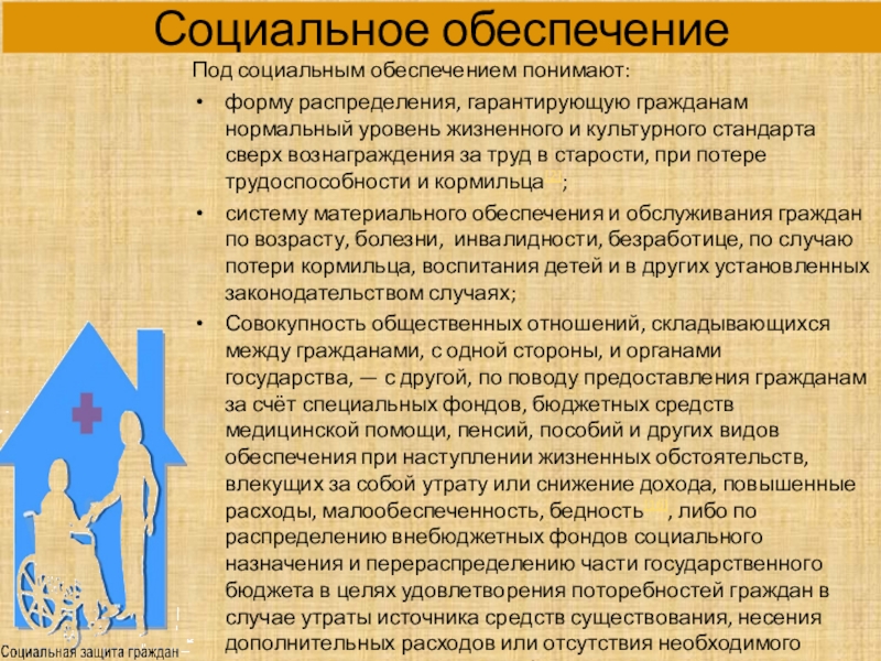 Совокупность общественных отношений, складывающихся между гражданами, с одной стороны, и органами государства, — с другой, по поводу предоставления гражданам за счёт специальных фондов, бюджетных средств медицинской помощи, пенсий, пособий и других видов обеспечения при наступлении жизненных обстоятельств, влекущих за собой утрату или снижение дохода, повышенные расходы, малообеспеченность, бедность[16], либо по распределению внебюджетных фондов социального назначения и перераспределению части государственного бюджета в целях удовлетворения поторебностей граждан в случае утраты источника средств существования, несения дополнительных расходов или отсутствия необходимого прожиточного минимума по объективным социально значимым причинам[
