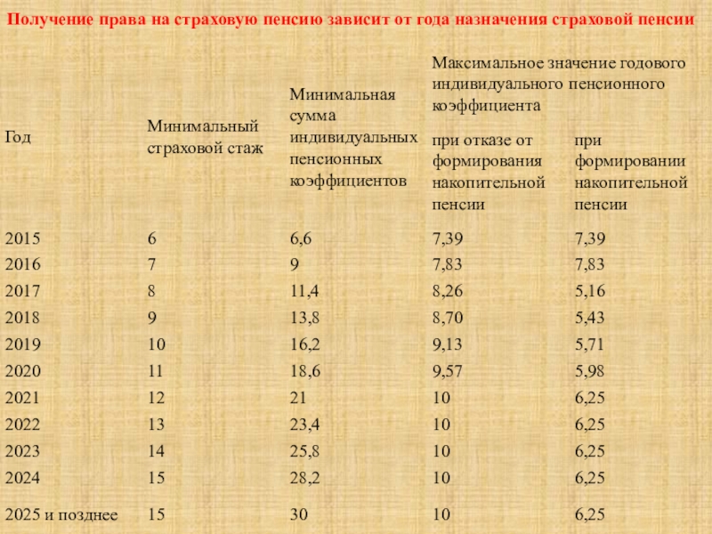 Слайд 39Получение права на страховую пенсию зависит от года назначения страховой пенсии