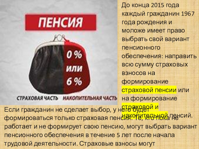 Если гражданин не сделает выбор, у него будет формироваться только страховая пенсия. Те, кто пока не работает и не формирует свою пенсию, могут выбрать вариант пенсионного обеспечения в течение 5 лет после начала трудовой деятельности. Страховые взносы могут распределяться по двум вариантам.