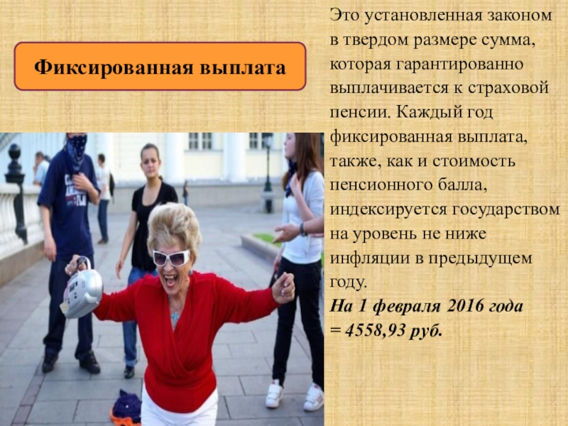 к страховой пенсии. Каждый год фиксированная выплата, также, как и стоимость пенсионного балла, индексируется государством на уровень не ниже инфляции в предыдущем году.