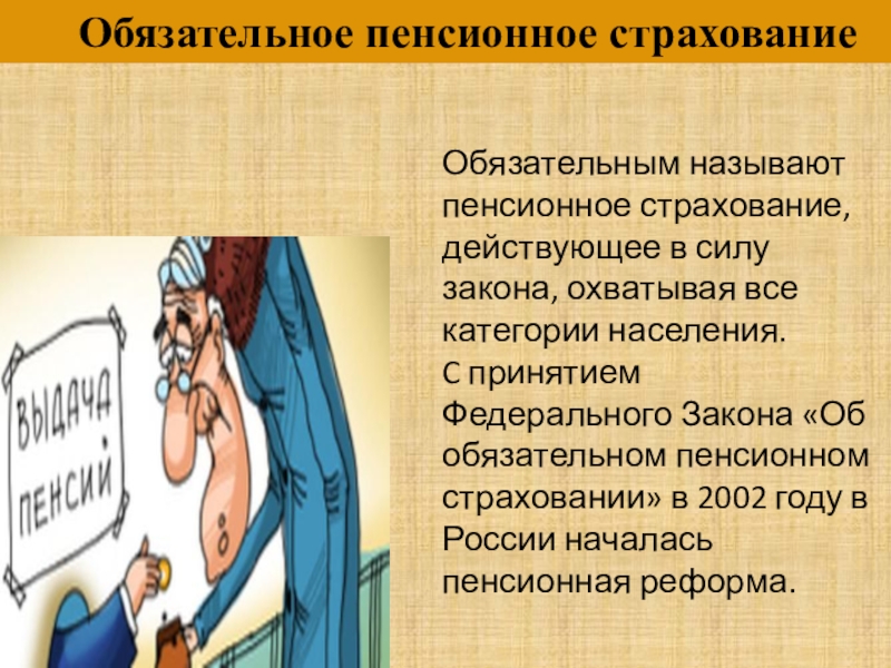 Обязательным называют пенсионное страхование, действующее в силу закона, охватывая