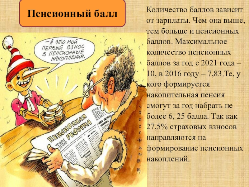 и пенсионных баллов. Максимальное количество пенсионных баллов за год с 2021 года – 10, в 2016 году – 7,83.Те, у кого формируется накопительная пенсия смогут за год набрать не более 6, 25 балла. Tак как 27,5% страховых взносов направляются на формирование пенсионных накоплений.